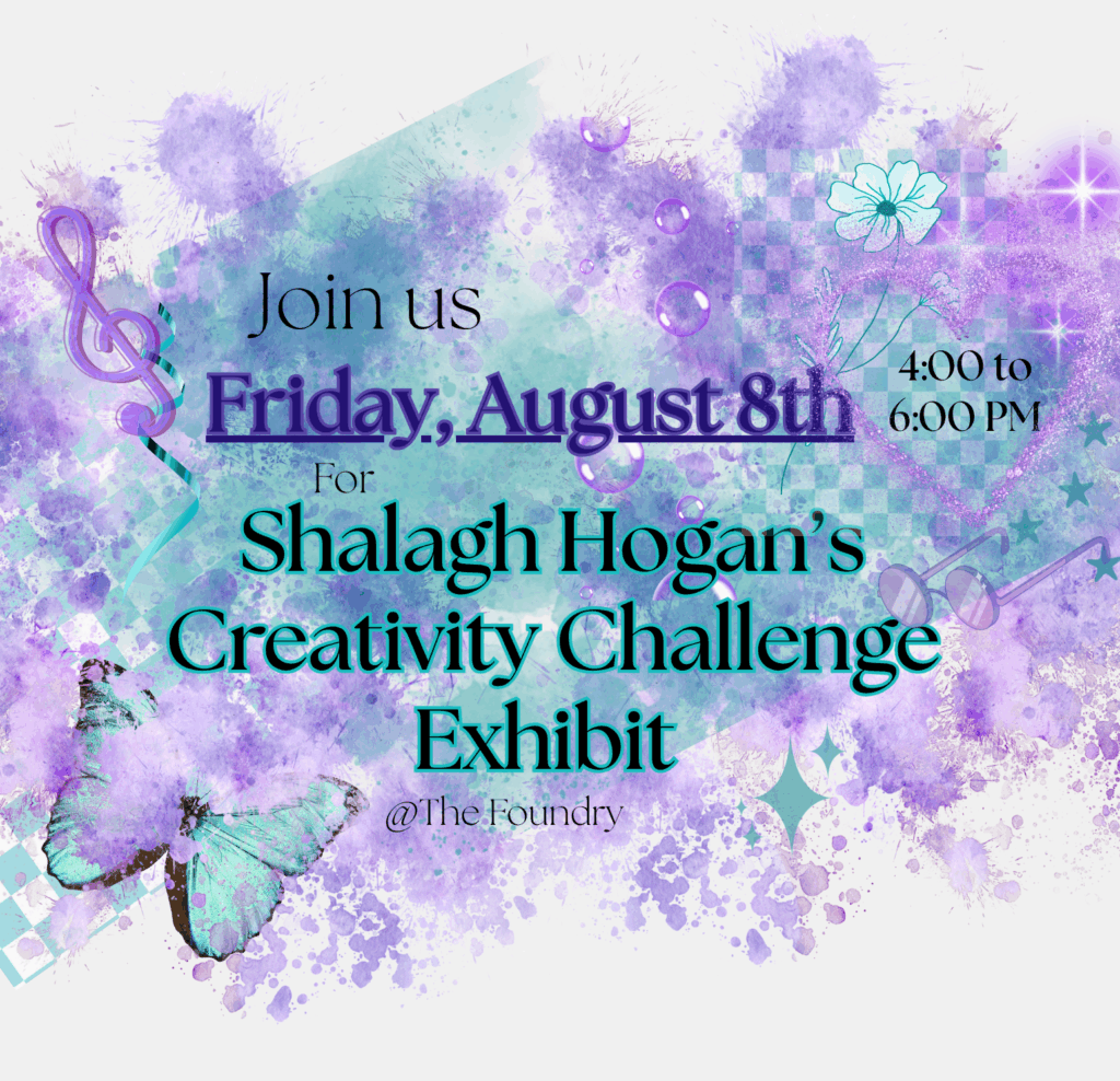 Join us at The Foundry on Friday, August 8th, 2025, from 4–6 PM for Shalagh Hogan’s Creativity Challenge Exhibit.