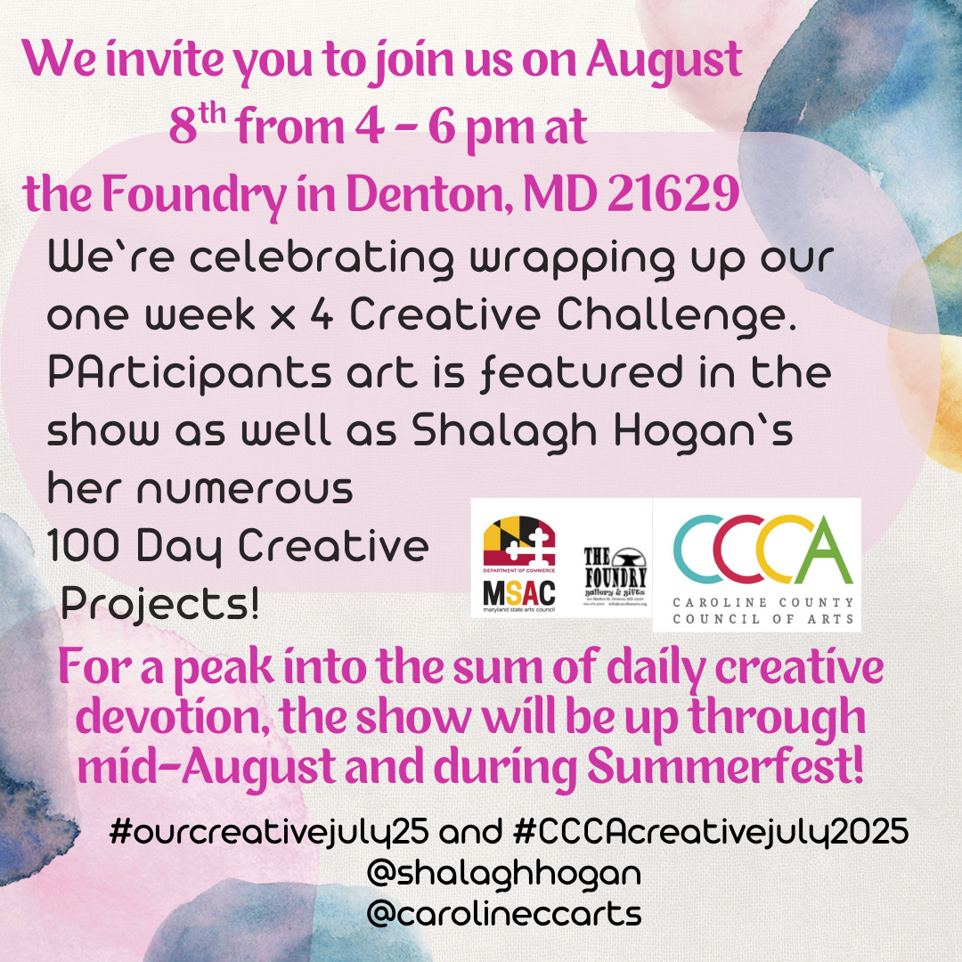 We celebrate her creative journey, daily creative practices, and the collective voice of our community. This July, she is The Foundry’s Artist of the Month and is also partnering with the Caroline County Council of Arts to host 7 Days of Art x 4—a creative community challenge beginning July 6th.